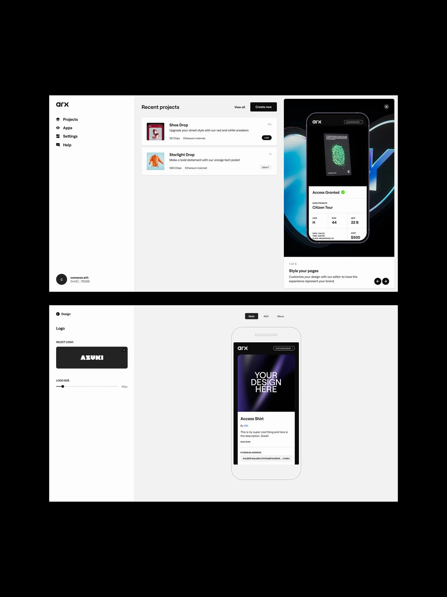 Den developed a unique graphic identity and designed a range of digital assets, including a website, digital platform, and custom tokens. The logo was crafted to look bold and striking, ensuring it retains clarity and impact across various media—from large screens to coin-sized chips. Enhanced with sleek animations and both 2D and 3D assets, the website elegantly showcases Arx Research's core functionalities and their distinctive collaborations in the realm of enduring physical crypto assets.